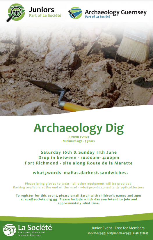 We invite our Juniors to come along and join us for an archaeological dig at our site along Route de la Marette, Fort Richmond. This is a drop in session, so please come along any time between 10:00-4:00pm. Site Location – what3words mafias.darkest.sandwiches.